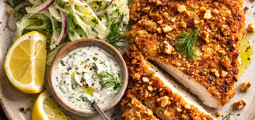 This walnut crusted chicken is crisp, flavourful and wonderfully satisfying. The nutty coating adds texture and richness, while a fresh fennel slaw provides a bright, crunchy contrast. Served with a squeeze of lemon and a light herb yoghurt, it makes a balanced and elegant meal.
